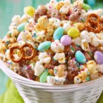 Bunny Bait Easter Snack Mix is a joyful, crunchy, sweet snack that screams spring. This easy Bunny Bait Easter Snack Mix blends popcorn, salty pretzels, colorful chocolate candies, and Easter-themed candies or marshmallows. A drizzle of melted white chocolate brings a sweet, creamy finish. The result is playful, colorful, and irresistible — perfect for baskets, parties, or simple snacking. 🐰