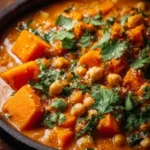 A warm, spicy vegetarian stew featuring chickpeas and sweet potatoes, balanced with fresh avocado and cilantro.