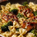 This simple, bright pasta dish mixes tender chicken, lemony cowboy butter, bowtie pasta, and broccoli. It cooks fast and tastes fresh. If you like easy chicken pasta meals, try a related cheesy garlic butter chicken bowties recipe for another weeknight option.