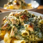 This recipe blends cooked pasta, shredded chicken, spinach, and creamy pesto sauce. It bakes until the cheese melts and the top turns golden. For a full written recipe and photos you can check the detailed recipe on Lillian Recipes for extra tips.