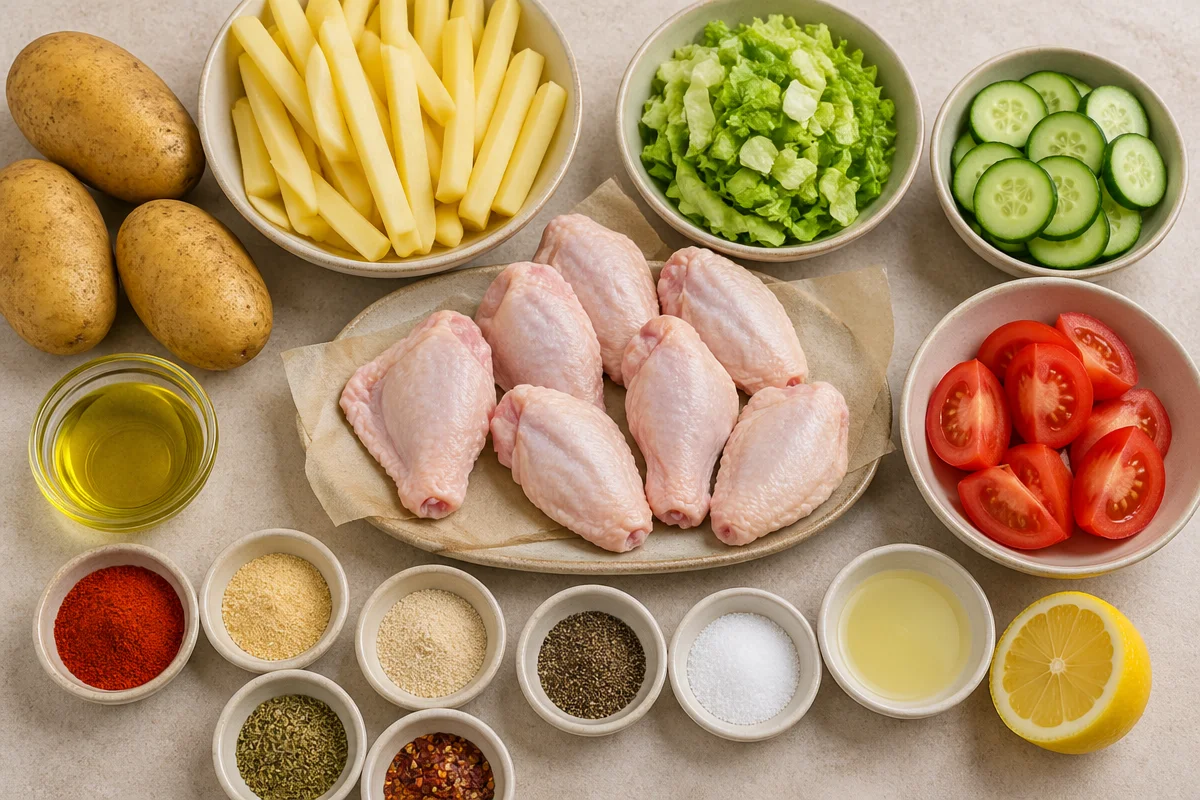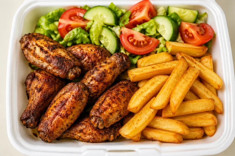 Prepare the garden salad: While the wings and fries are baking, toss the chopped lettuce, cucumber slices, and tomato wedges together. Drizzle with lemon juice and a pinch of salt. This fresh salad balances the dish’s rich flavors. Just avoid over-dressing, which can lead to a soggy salad.