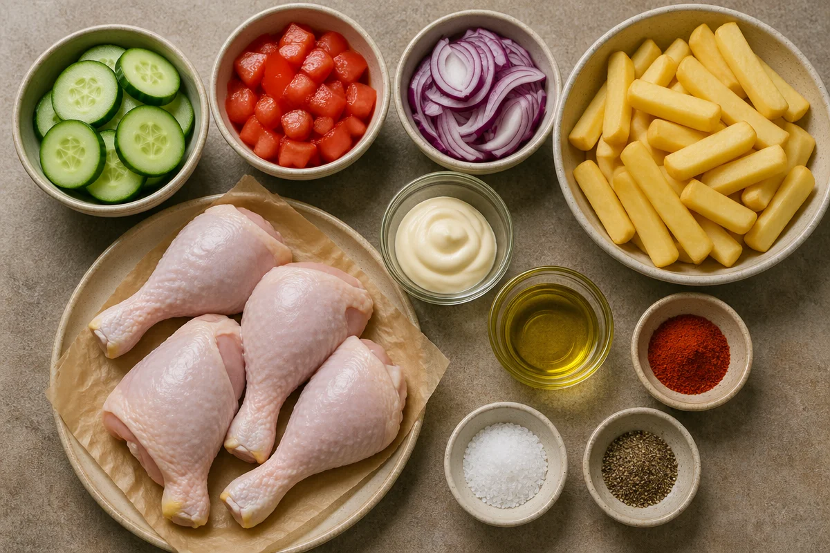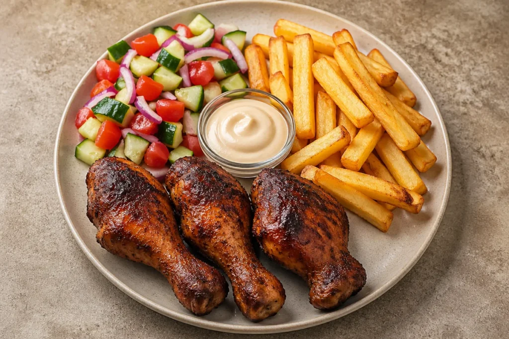 To make the Ultimate Crispy Chicken Plate – Drumsticks, Fries & Fresh Salad, start by seasoning the chicken drumsticks with olive oil, paprika, salt, and pepper. This step is crucial for maximizing flavor. Bake the drumsticks to achieve that golden, crispy skin while retaining juiciness. Concurrently, cook the thick-cut fries until they are perfectly golden brown and crunchy. As you prep a fresh salad with cucumber, tomatoes, and onions, you’ll bring brightness to the dish. Finally, plate everything beautifully, and don’t forget to add your favorite dipping sauce. Follow these steps, and you’ll know how to make the Ultimate Crispy Chicken Plate – Drumsticks, Fries & Fresh Salad that everyone will love.