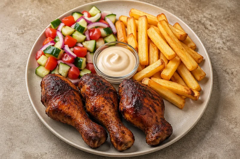 The Ultimate Crispy Chicken Plate – Drumsticks, Fries & Fresh Salad celebrates classic comfort food with a twist. The crispy chicken is the star, with its golden, crunchy skin and juicy meat inviting you to take a bite. The thick-cut fries bring a satisfying crunch, while the vibrant salad adds a refreshing contrast, combining crisp cucumber, juicy tomatoes, and zesty red onions. The aroma of roasted chicken mingled with seasoned fries fills the kitchen, making it a go-to dish for family dinners or casual get-togethers. Home cooks love making this simple, flavorful meal because it’s satisfying and brings everyone together around the table. One bite of this dish, and you’ll be ready to dive in and savor the delicious flavors that make it so irresistible.