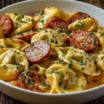 A hearty and comforting dish featuring cheddar pierogies and smoky kielbasa, slow-cooked for warm flavors and satisfaction.