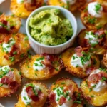 Crispy mini potato skins filled with cheese, bacon, and herbs, perfect for snacks or parties.