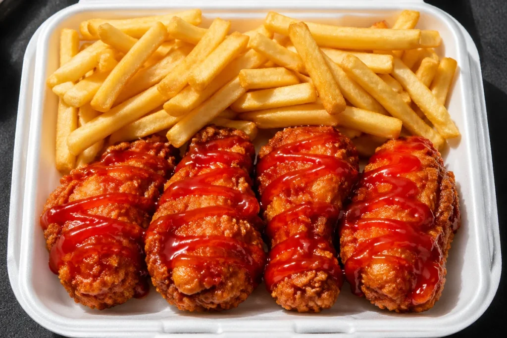 - Pack the crispy chicken and fries into a meal box and drizzle with ketchup or chili sauce.