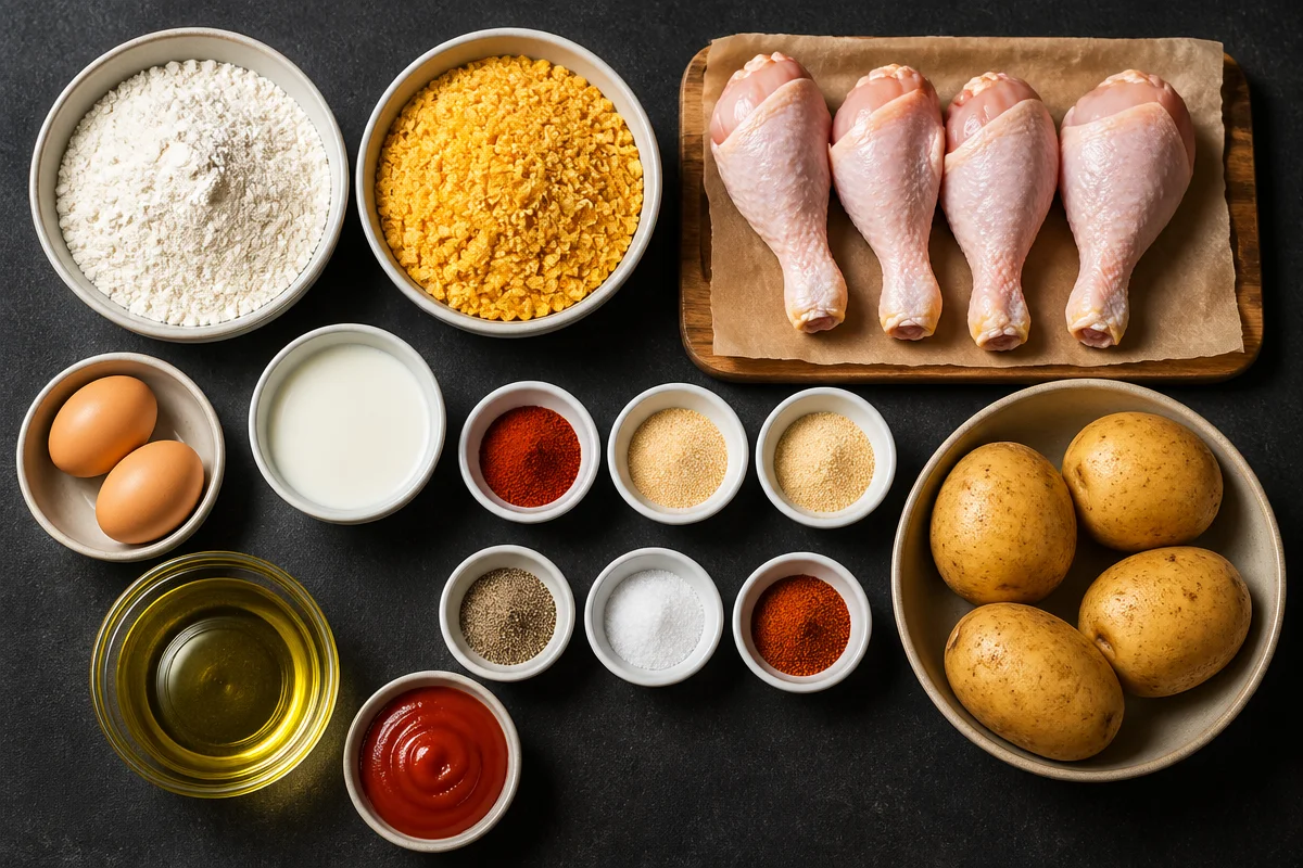 When choosing ingredients, opt for fresh chicken that feels firm to the touch. Organic or free-range options often have a richer flavor. For potatoes, select starchy varieties like Russets for the best fry texture. If you need dietary substitutions, use gluten-free flour and cornflakes, or swap the buttermilk for a dairy-free milk mixed with lemon juice. For a vegan version, consider using tofu or jackfruit instead of chicken.