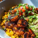 This bowl is bright, fast, and full of flavor. You get smoky grilled shrimp, sweet corn salsa, creamy avocado, and a garlic sauce that ties it all together. It works for a quick weeknight meal or a simple weekend lunch.