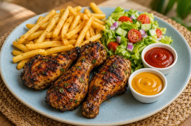 How to Serve Juicy Grilled Chicken Drumsticks with Fries & Fresh Salad