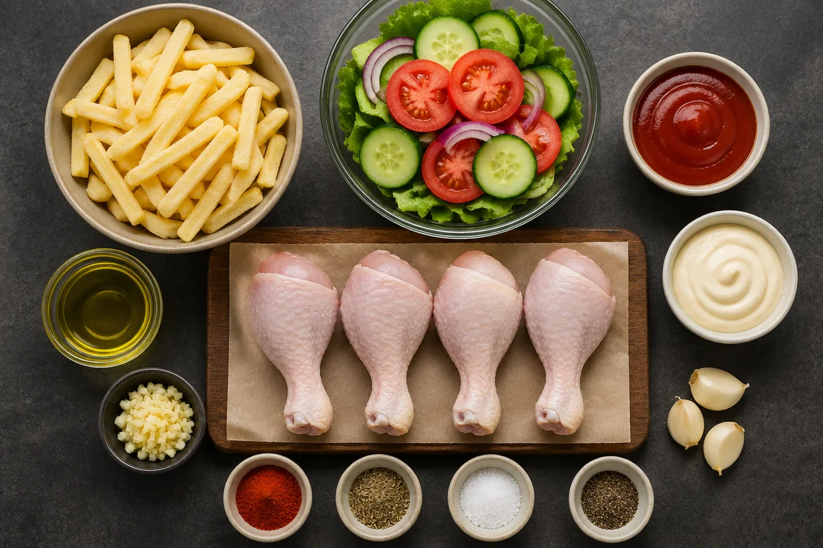 When selecting chicken drumsticks, look for plump, fresh pieces without any discoloration. For the best quality, choose organic or free-range chicken whenever possible. Fresh herbs bring out the best flavors, but if you’re in a pinch, dried herbs work well for seasoning. For substitutions, consider dairy-free mayo or sauces for dairy-free diets, use gluten-free fries if necessary, or try tofu for a vegetarian option.
