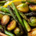 A simple, healthy side dish of roasted asparagus and Brussels sprouts, featuring bright lemon notes and caramelized edges, perfect for low-carb and keto diets.