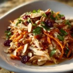 This Asian chicken cranberry salad is bright, fresh, and fast. It mixes warm cooked chicken with crunchy greens, tart cranberries, nutty almonds, and a salty-sesame dressing. The smell is warm and sesame-forward with a faint sweet note from honey. The taste is a balance: savory soy, nutty sesame, sweet-tart cranberries, and mild chicken. The texture pairs soft shredded chicken with crisp greens and a pleasant crunch from almonds. Together they make a light but filling meal that feels special.