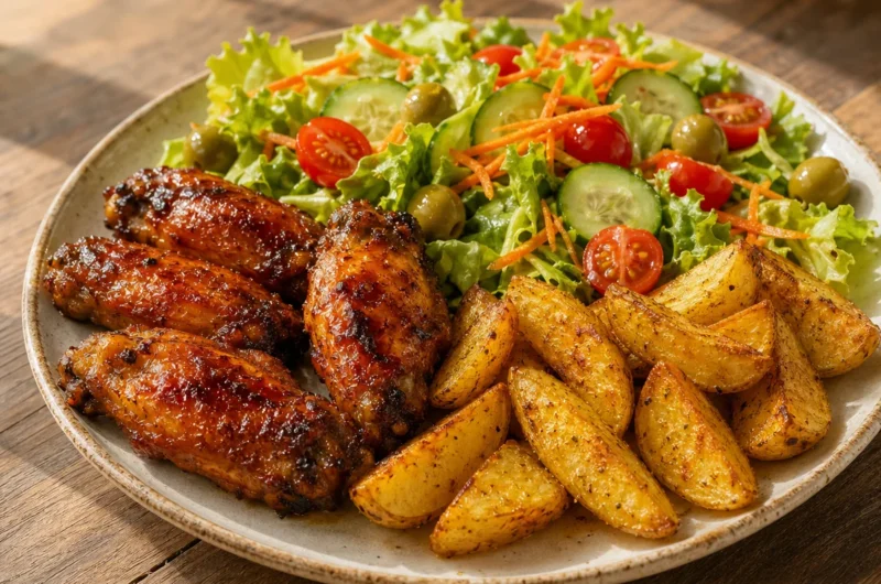 - Plate and serve the wings with potato wedges and salad for a balanced meal.