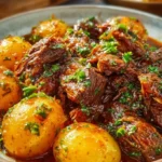 A tender beef dish with soft potatoes and a rich garlic butter sauce, cooked low and slow in a slow cooker.