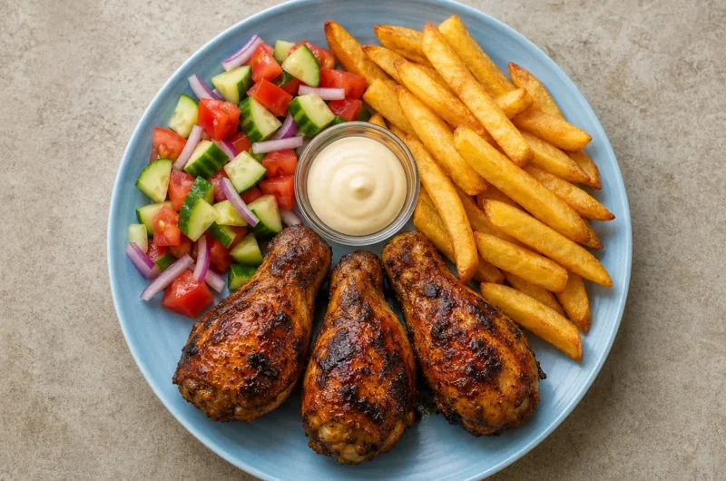 - Assemble & Serve: Once everything is ready, plate the chicken drumsticks, fries, and the fresh salad. You can add mayo or your favorite dipping sauce on the side.