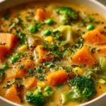 This soup tastes like a pot pie in a bowl. You get carrots, potatoes, broccoli, peas, and corn in a thick, creamy broth. The soup cooks on the stove in one pot. It makes a good weeknight dinner or a meal to share. It stays good in the fridge and rewarms well.
